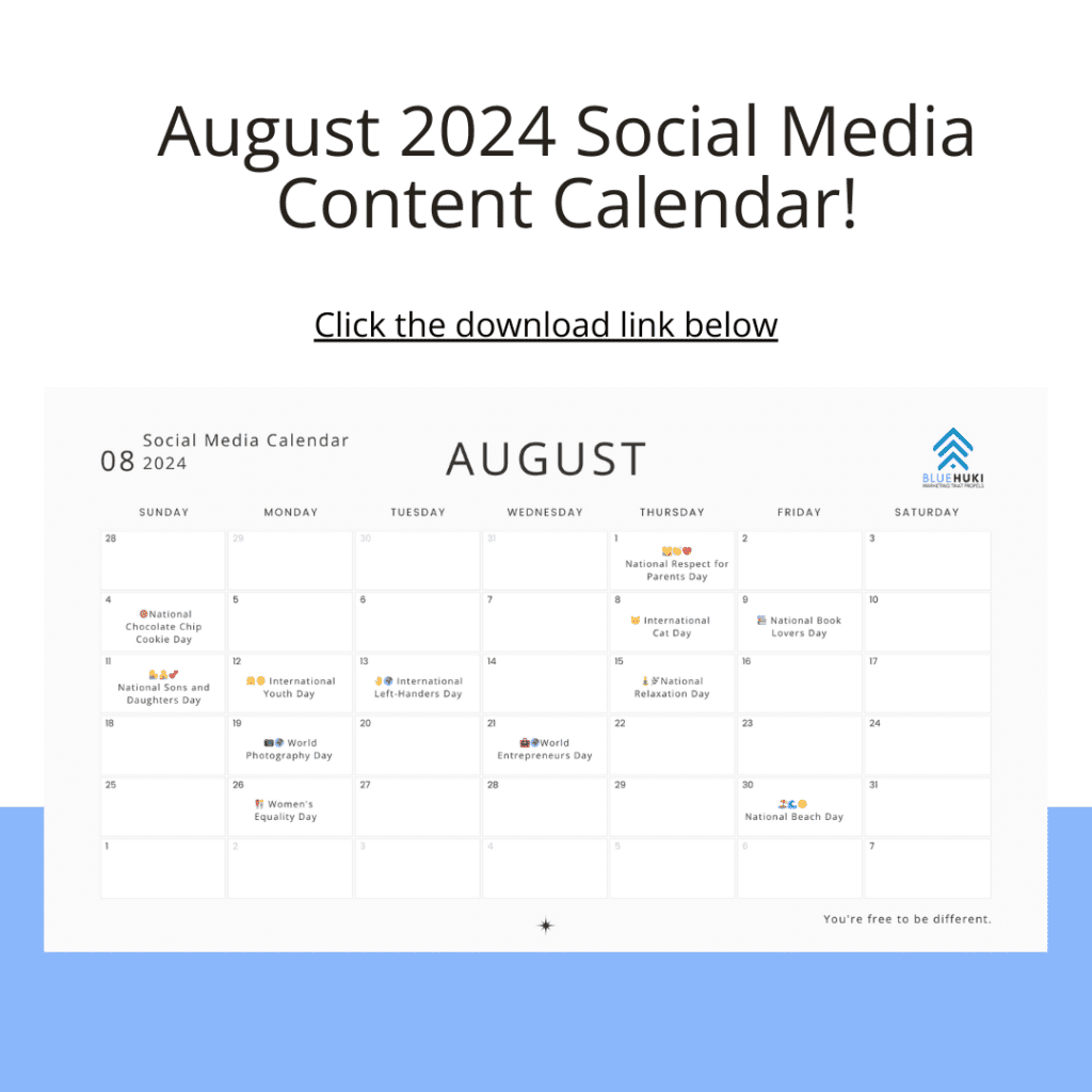 BlueHuki stands ready to be your partner in August 2024, guiding your brand to success in the dynamic world of social media. With our carefully crafted content calendar, you’ll engage your audience, foster connections, and elevate your online presence. Let’s make August 2024 a month to remember!