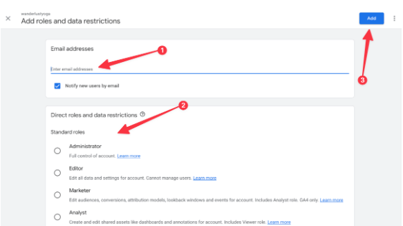 Once that’s confirmed, here’s how to grant access to someone else via your Google Analytics dashboard: