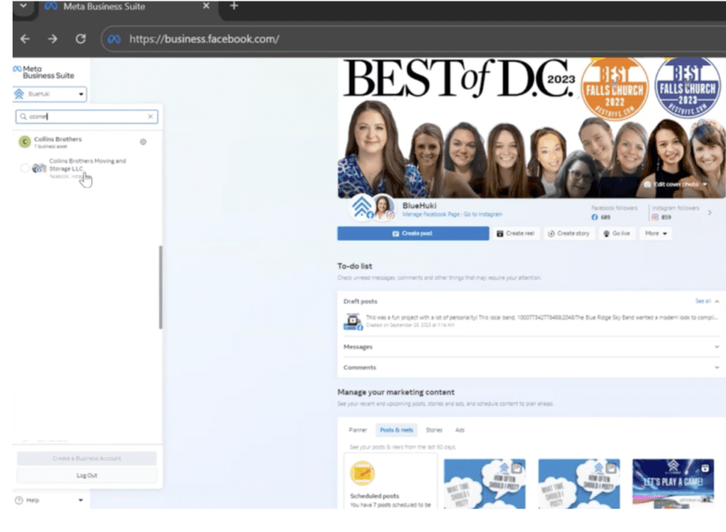 Ideal Outcome: BlueHuki social media manager account will have access (but not ownership) to Meta Business Suite.