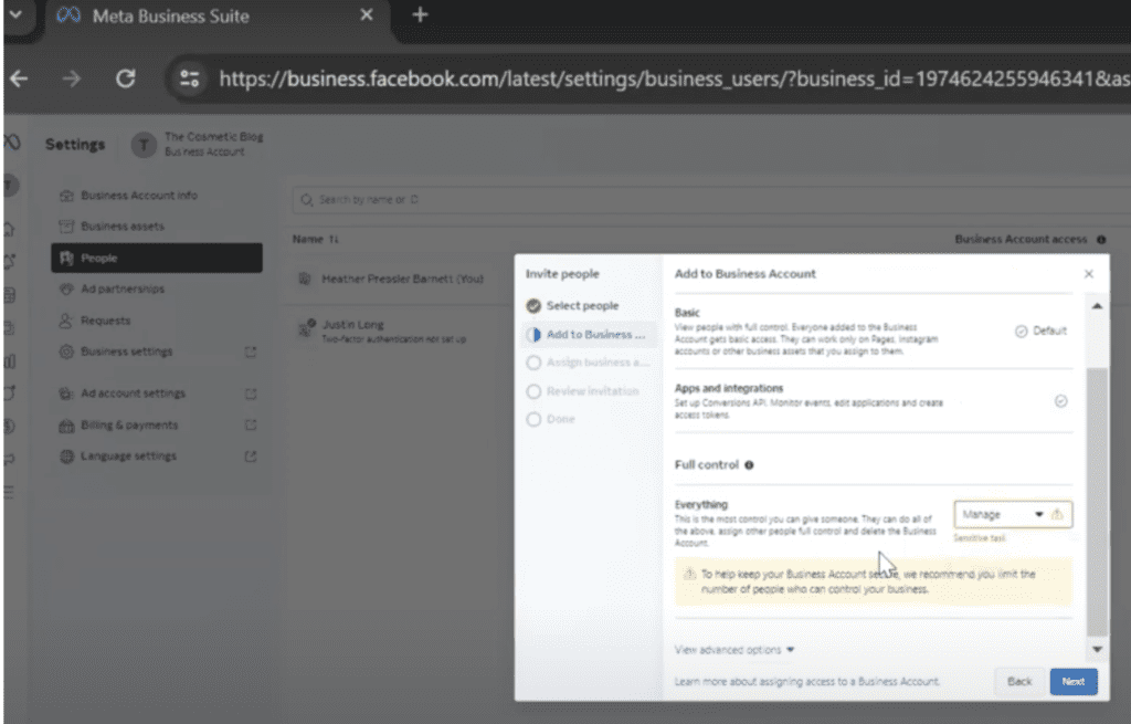 3. Enter the email address of the person that you want to give access to (ideally their work email, it doesn’t need to be the email associated with their personal Facebook account), make sure you are assigning the “Full Control” which will allow to manage the ads and social media posts and click “Next”;