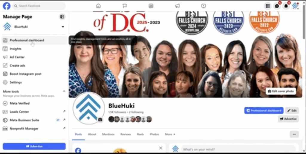 ✔ You switched into the Page (so the Manage Page sidebar appears) - Open the Professional Dashboard