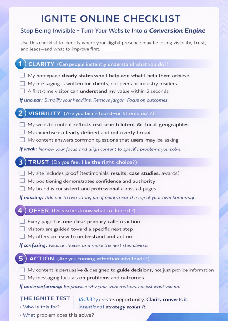 Clarity ensures that visitors immediately understand who you help and what you do. Visibility ensures that the right audience finds you. Trust builds the confidence needed to choose you. A strong offer makes the next step obvious. While encouraging action guides users toward reaching out and becoming clients.